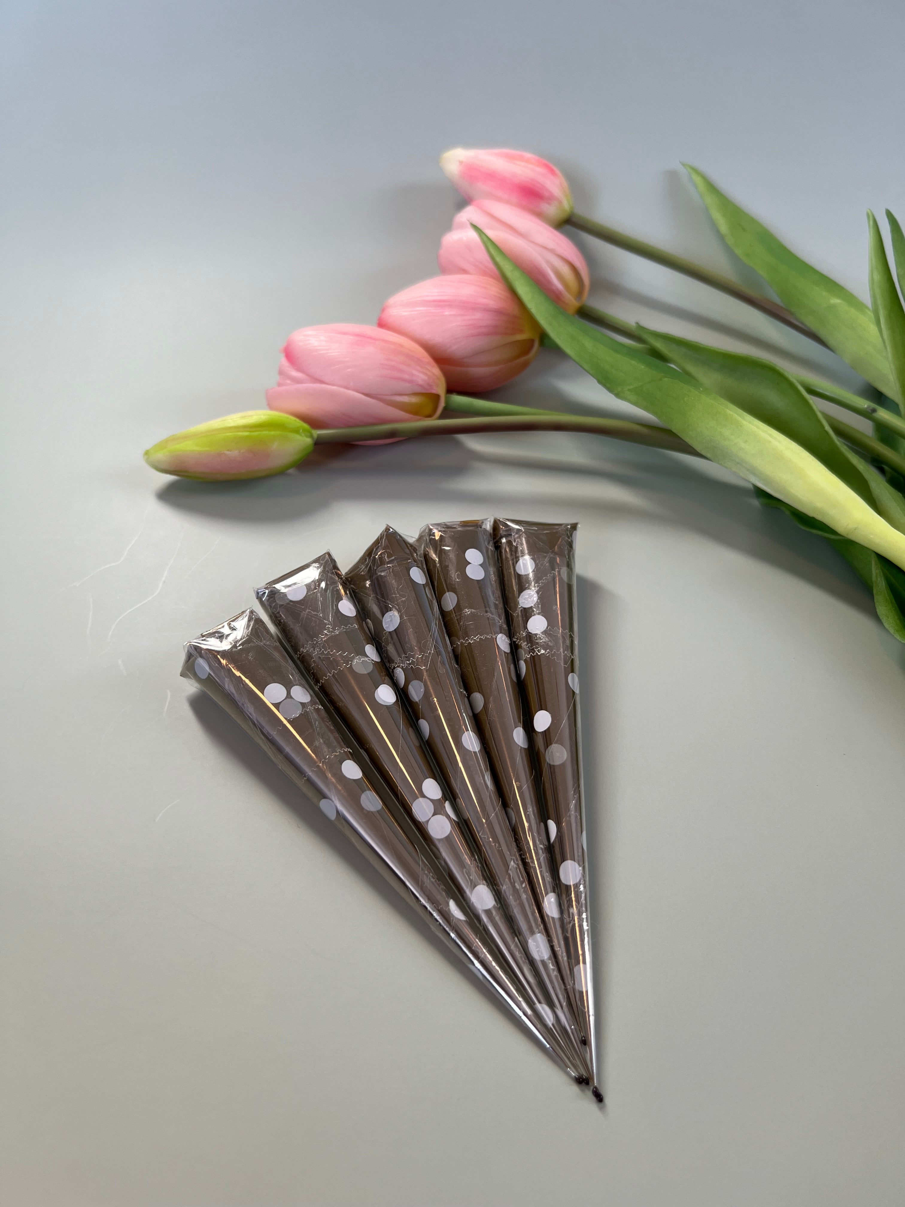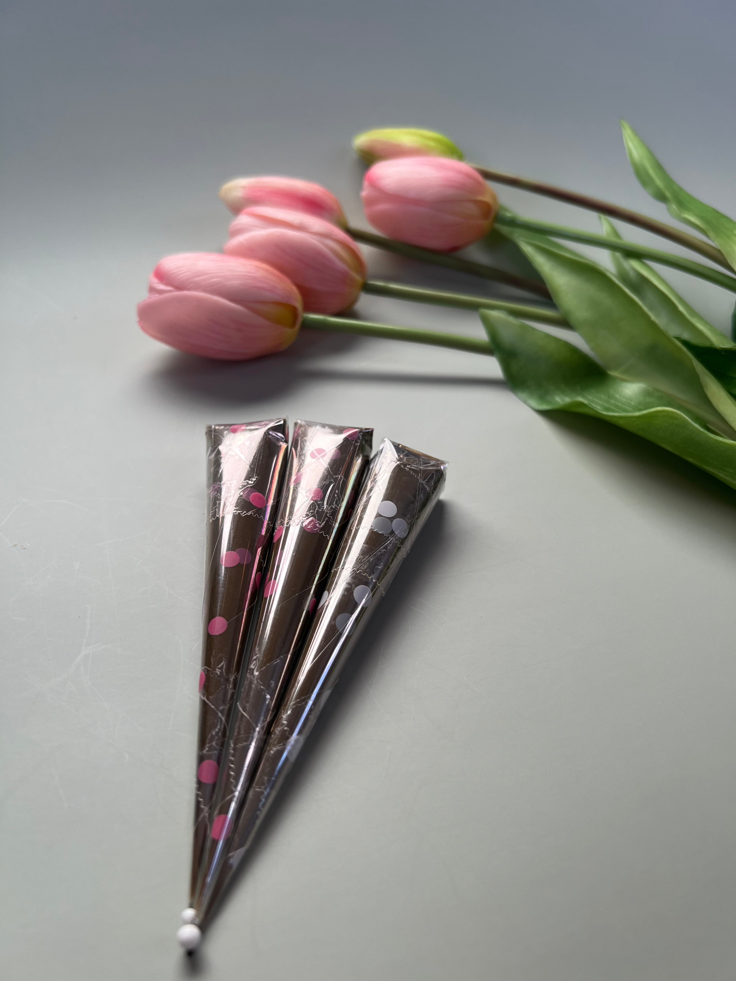 Natural henna cones are made with triple sifted organic henna, essential oil, lemon juice, and sugar. They are packaged in 16-18g cones made out of hand-rolled cellophane.